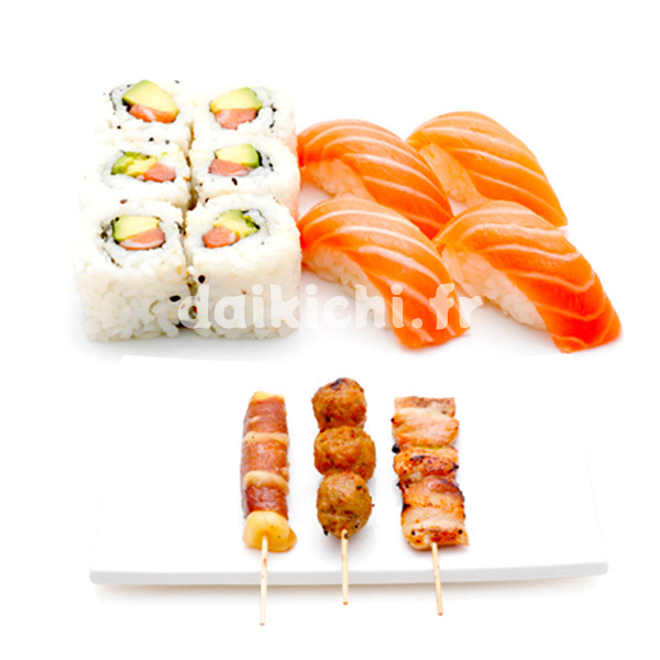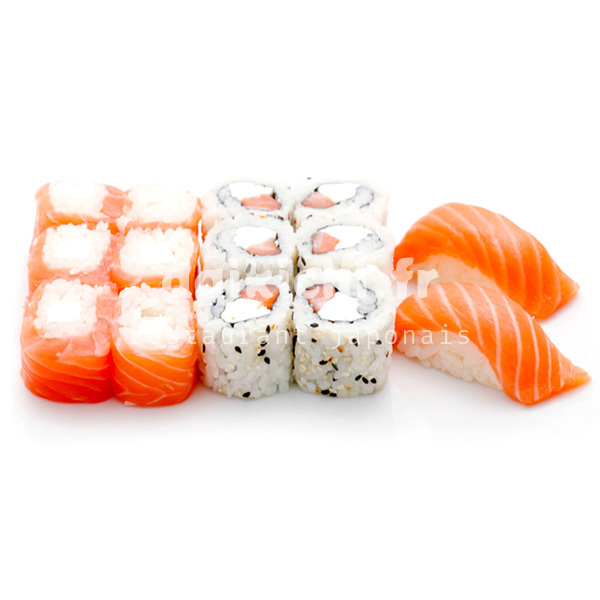 6 california saumon avocat, 9 sashimis saumon, accompagner soupe, salade et riz